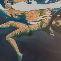 The captivating reflections, refractions, and distortions caught in underwater photographs are the focus for this ongoing series of paintings. I photograph friends and family, including myself and my children, and I’m drawn to paint those images that reveal the otherworldly, blissful, and ominous experience of being underwater. I aim for a faithful rendering of the images, which are too fantastical to invent.